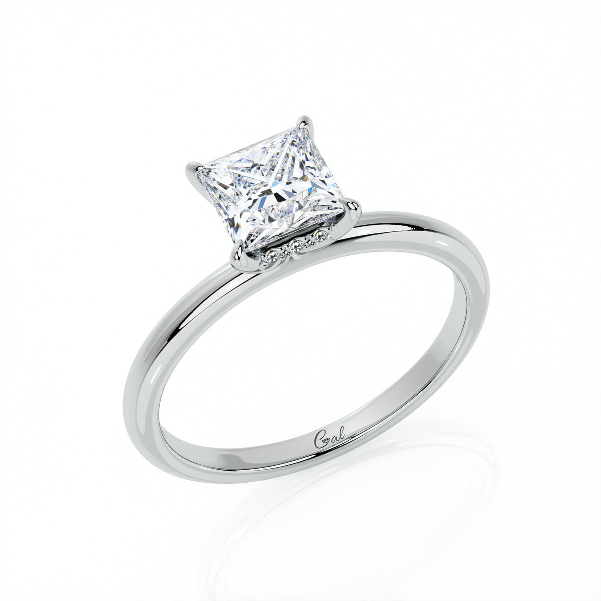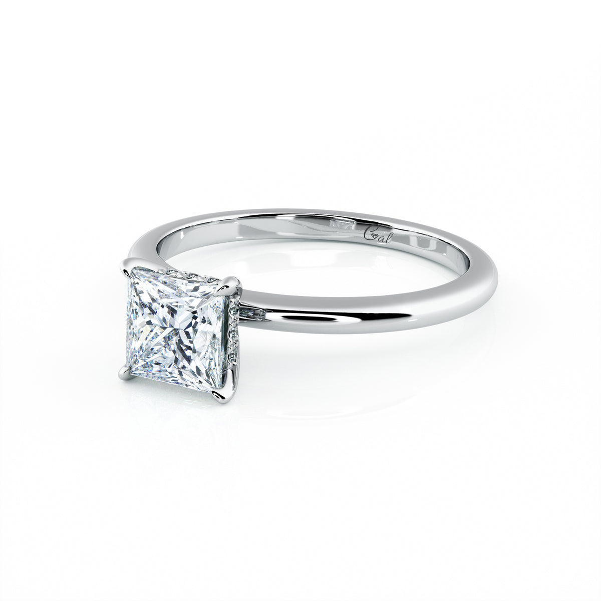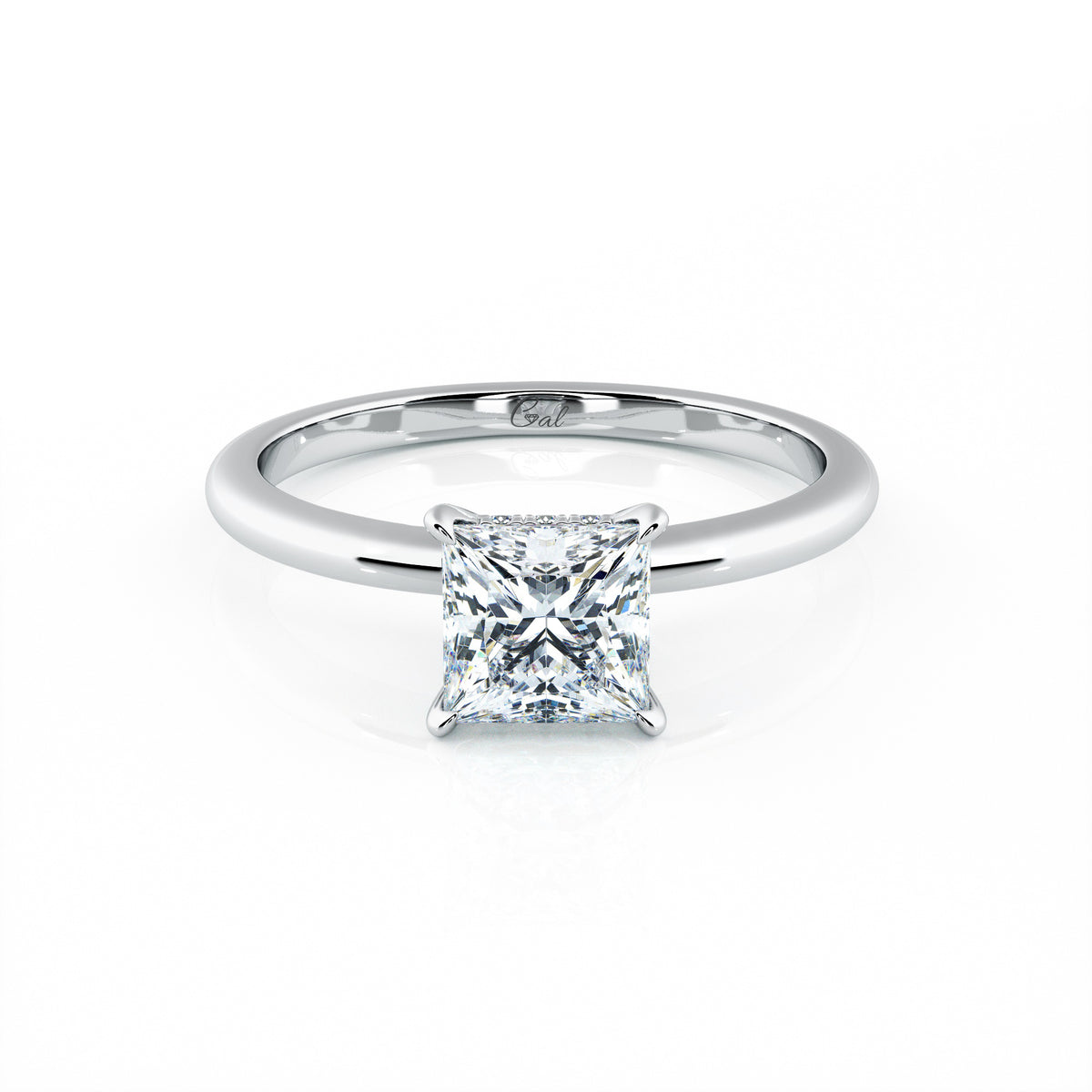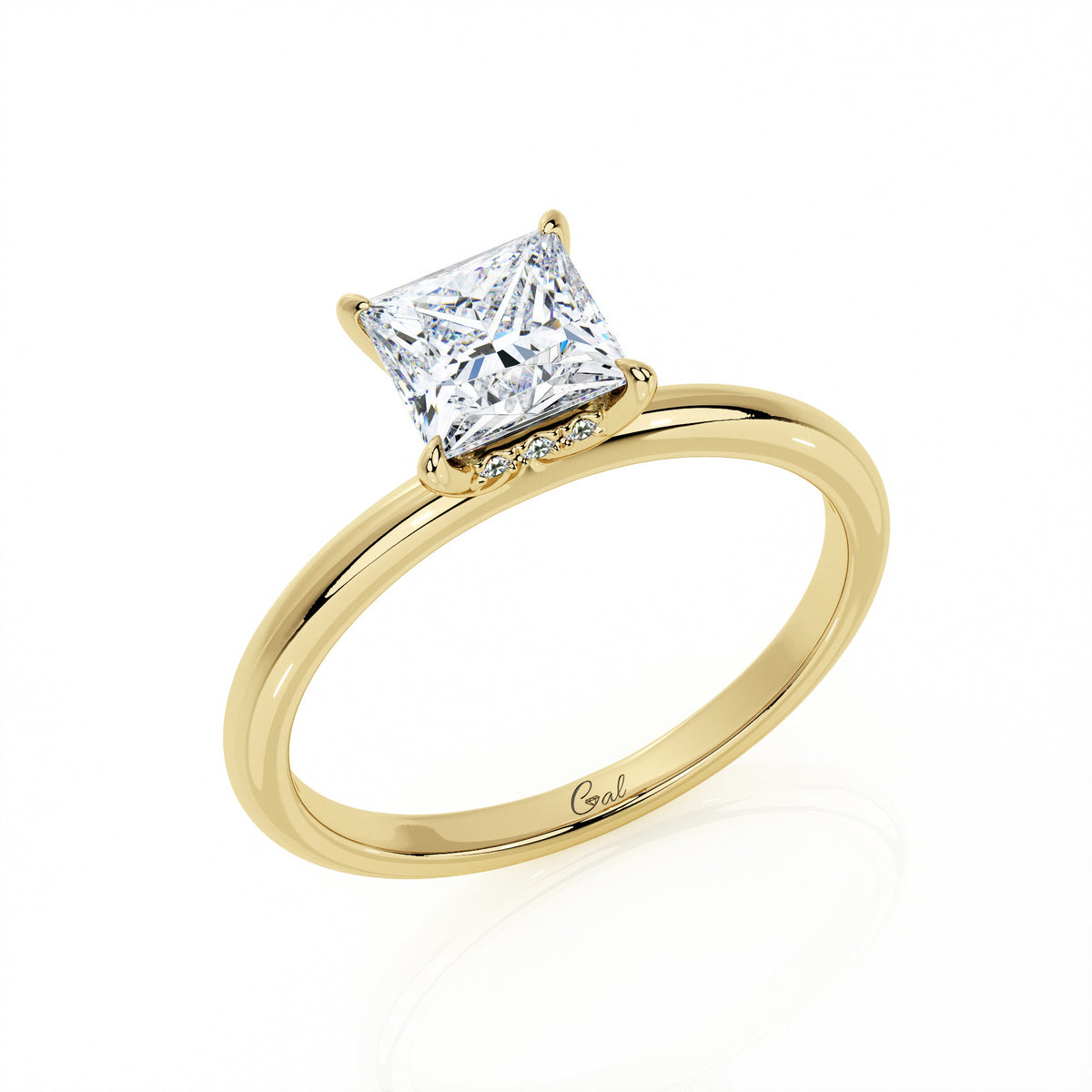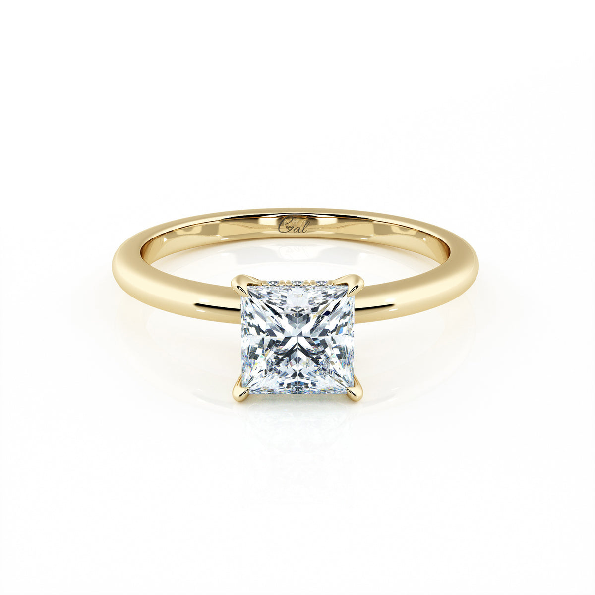 A classic Gal Diamonds signature solitaire design. This ring features a 1.00 carat Princess shape diamond set in a solitaire hidden halo.Handcrafted in 18K gold.