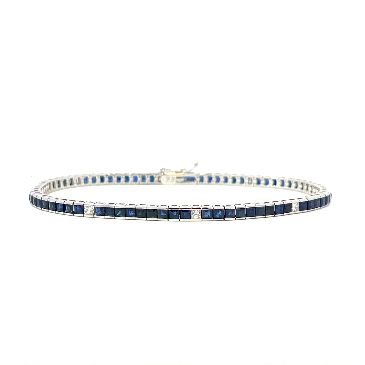 Indulge in sophistication with our exquisite tennis bracelet, featuring mesmerizing princess-cut blue sapphires and dazzling diamonds elegantly set within a sleek channel design. Each sapphire, with its deep and alluring hue, exudes timeless elegance, while the sparkling diamonds add a touch of luxury and brilliance. Meticulously crafted to perfection, this bracelet seamlessly combines classic charm with modern allure, making it the perfect accessory for any occasion. Elevate your ensemble with the enchanting beauty of this breathtaking piece, destined to become a cherished treasure in your jewelry collection.